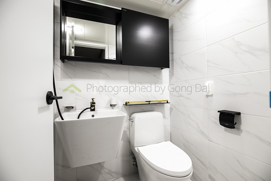 미러수납장과 블랙 파티션이 실용성을 높입니다.